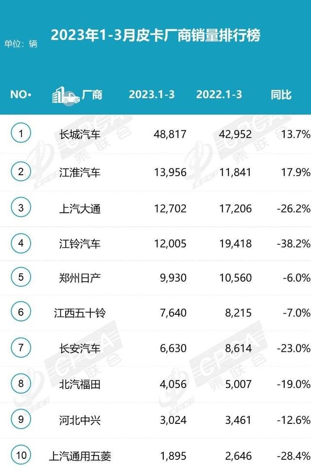 后最,23年1-3月份皮卡厂商批发销量榜TOP10本文(含题目)的销量均来流于乘联会发布的20;、“销量榜”等字样所涉及到的“榜”,别指明如非特,皮卡厂商销量前10名榜单均为2023年1-3月份,参考仅供。
