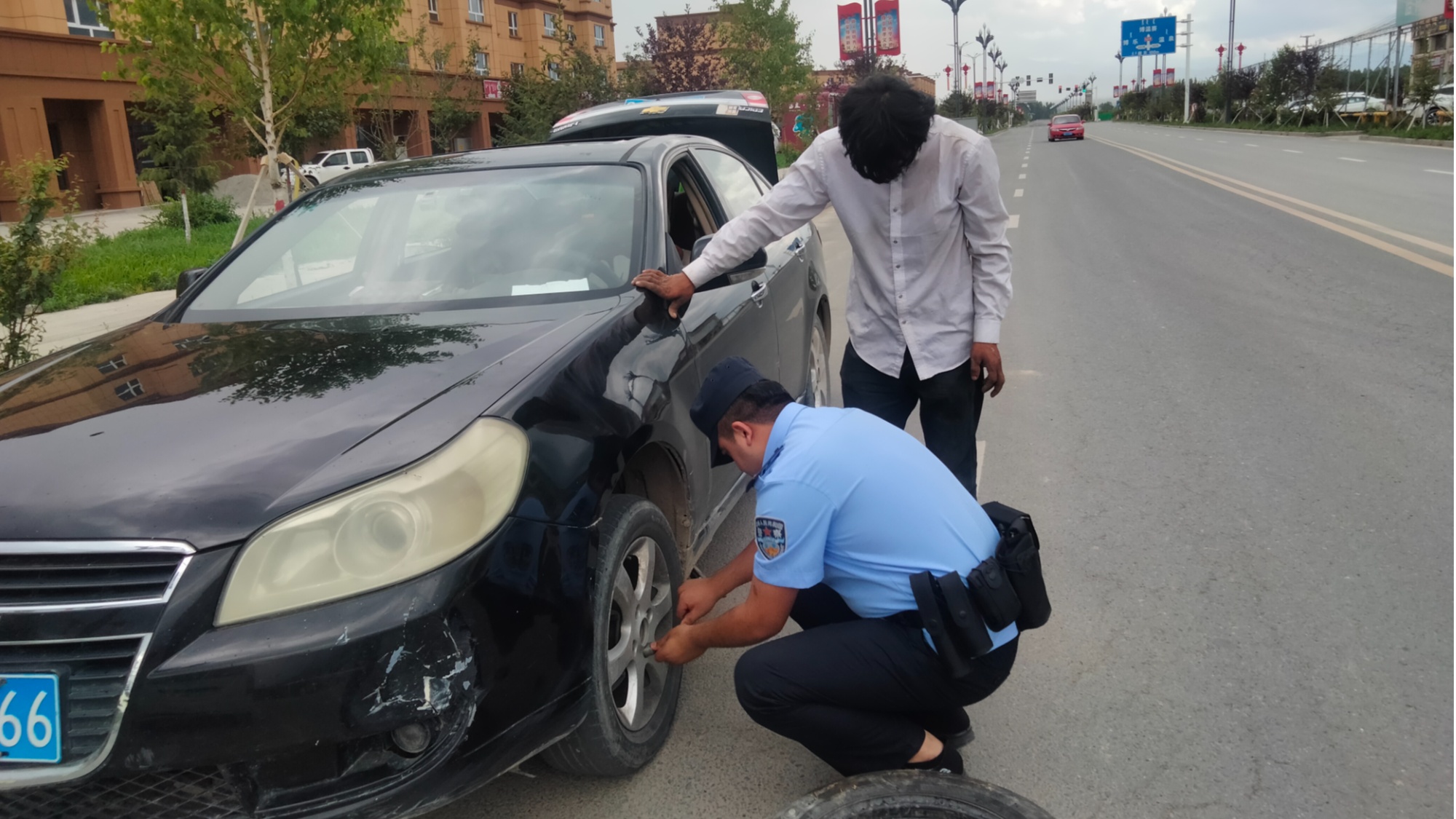 车辆后正在简单查看乘龙h59。6厢式货车,平安三角警示牌后正在车辆后方设立五菱微型小厢货车,车从改换备用轮胎拿起东西熟练地为。胎过程外正在改换轮,平安学问和简单的维修学问还不忘向李先生宣传交通,先生并李,路交通平安时辰留意道。
