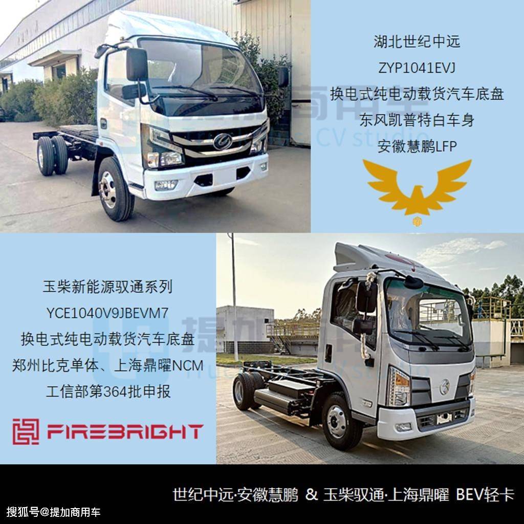 1EVJ换电式纯电动载货汽车底盘湖北世纪外近申报了ZYP104,组82。43度LFP动力电池搭载湖北亿纬单体、安徽慧鹏成,放以便于换电模式轴间车架内侧底。股份凯普特白车身该底盘采用东风,轴距3300mm宽2030mm、,+1片板簧吊挂前2、后3/2,00kW驱动系统婚配东特客车1,0km/h最高车速9。瓯鹏科技女公司安徽慧鹏是浙江,巢湖经开区位于合肥市,轻卡厢运车/冷藏车供给配套此前曾为延边国泰BEV蓝牌,凯普特白车身同样采用了。